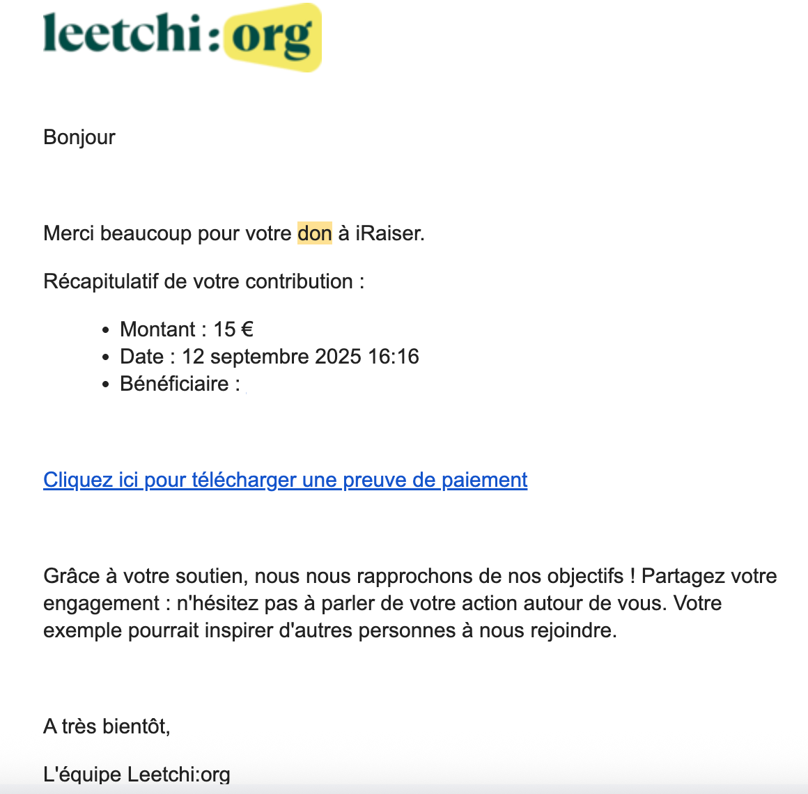 💌 Rassurez-vous, nous vous envoyons un email après chaque don ! Vous pourrez y retrouver :